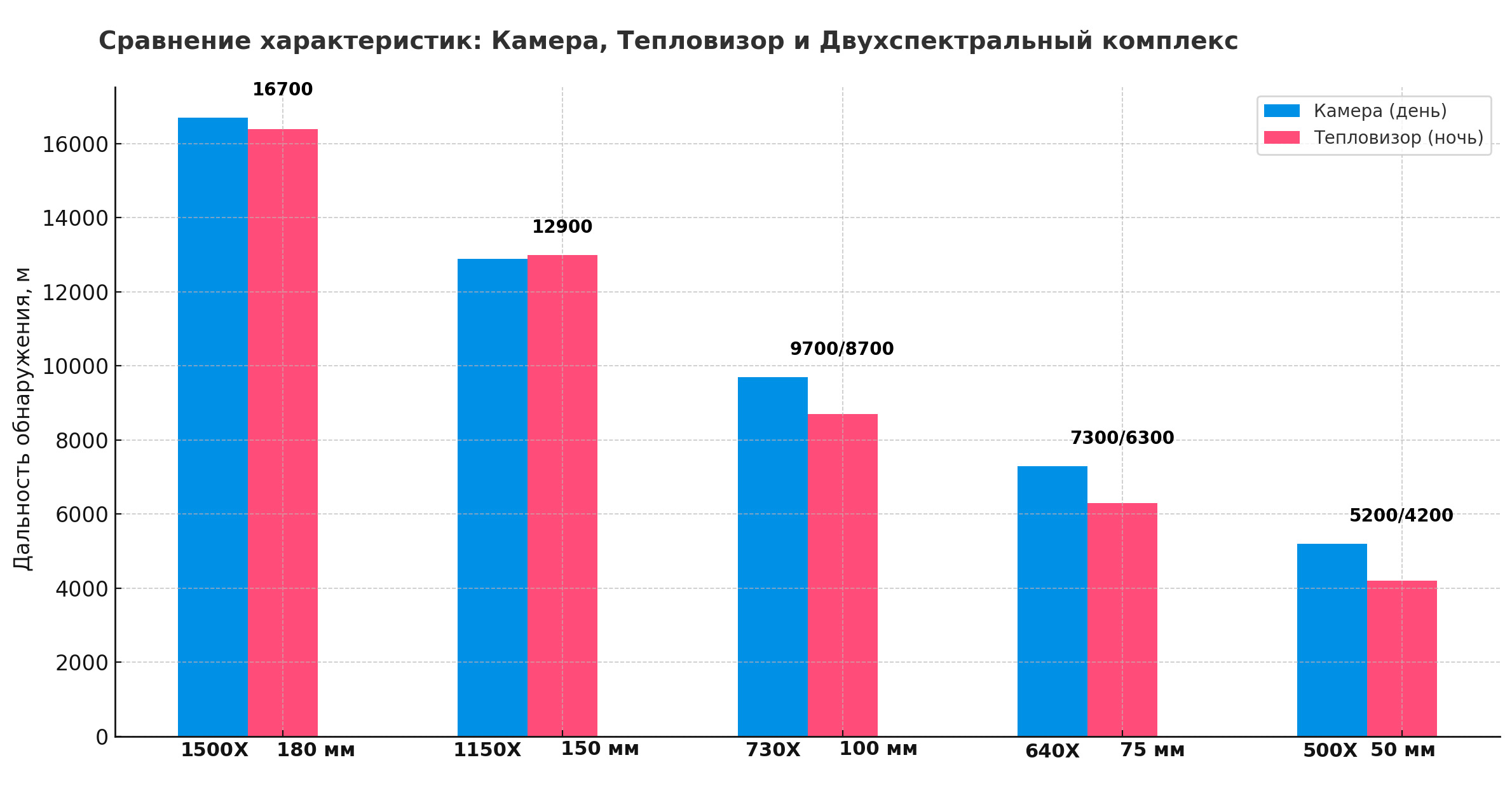 Для тепловизоров предусмотрено использование пяти типов линз (50 мм, 75 мм, 100 мм, 150 мм и 180 мм), что позволяет варьировать дальность обнаружения от 4,2 км до 16,4 км в зависимости от выбранной оптики. Такой подход обеспечивает гибкость применения — от ближнего наблюдения до дальних дистанций.